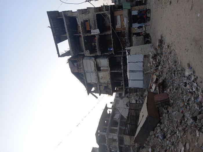 The image depicts a scene of widespread urban devastation in Khan Yunis, Palestinian Territory, under a bright, clear sky. In the foreground, a dirt path extends from the lower right towards the center, bordered on the left by a large pile of rubble composed of concrete fragments, twisted metal, and assorted debris. A large, dark, rectangular object, possibly an overturned structural beam or piece of furniture, rests prominently on this rubble heap. To the immediate left of the path, behind the foreground rubble, is a makeshift structure constructed from what appears to be corrugated metal or salvaged wood. Further back, a temporary shelter or storage unit is visible, covered with white tarpaulin or fabric sheets. Dominating the mid-ground are two multi-story concrete buildings, both exhibiting extensive damage. The building on the right, approximately five to six stories tall, has significant structural compromise, with large sections of exterior walls missing, exposing internal floor plates, rebar, and charred interiors. Several openings are boarded with makeshift materials, and what appears to be laundry hangs from an exposed section on a lower floor. The ground level of this building shows partial integrity, with a darker, storefront-like entrance. To the left and slightly behind this building, another multi-story structure (at least four to five stories visible) is severely damaged, appearing partially collapsed with exposed frameworks and missing sections of walls and roofs. Further damaged structures are discernible in the background, extending into the distant skyline. A small group of approximately three to four individuals is visible near the base of the right-side damaged building, on the dirt path. Adjacent to them is a stationary small, three-wheeled utility vehicle or motorized rickshaw. Overhead utility lines traverse the upper portion of the frame against the bright sky.