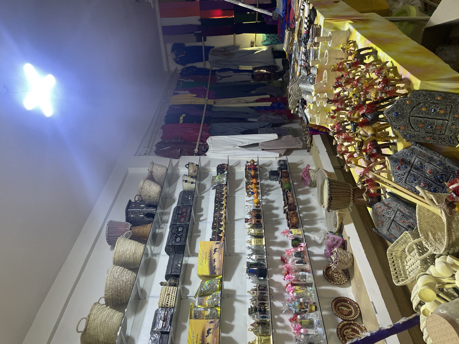 A well-lit shop displays a variety of goods. Woven baskets and embellished boxes line shelves on the left. Clothing hangs above. Further right, shelves showcase small decorative items, including souvenirs. A table displays wooden horse figures and ornamented boxes. The merchandise suggests a market setting or souvenir shop.