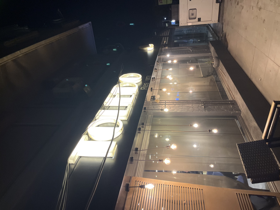 A tilted view of a restaurant at night