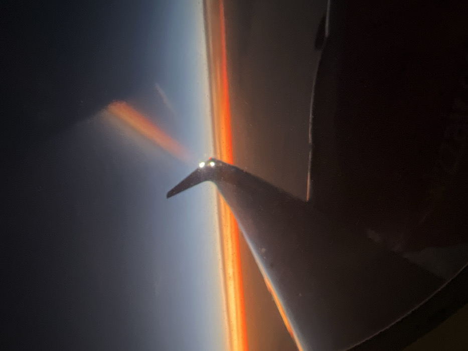 An airplane wing is positioned in the frame's right side, with two bright lights visible at its tip. Outside the window, a vibrant orange and red band stretches across the horizon. Above it, a gradient sky transitions from blue to black. A unique optical phenomenon, resembling a rainbow-like streak, extends into the dark sky. This could be a contrail refracting sunlight.