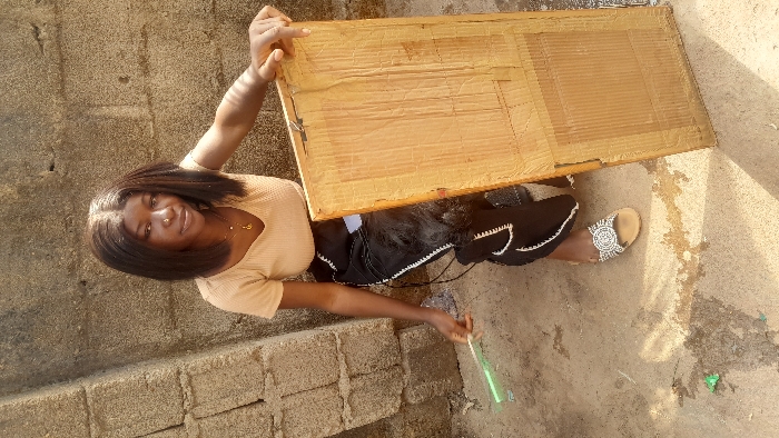 A young adult female is depicted in a crouching or squatting position on sandy, dirt-colored ground in Akwanga, Nigeria. She has dark, shoulder-length hair parted in the center, and wears a light-colored, ribbed, short-sleeve top with a V-neck, a dark skirt or pants with white trim, and white and tan patterned slide sandals on her feet. A gold-colored necklace with a pendant is visible, and she appears to have a nose piercing. In her left hand, she holds a translucent green, rectangular object, possibly a plastic ruler. Her right hand rests on the top edge of a large, vertical piece of corrugated cardboard, approximately waist-height, which is light brown, worn, and shows visible creases and tape. The cardboard stands on the ground to her right. The background consists of a rough, light grey/brown masonry block wall. Direct sunlight casts shadows on the ground.
