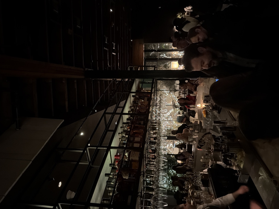 A dimly lit restaurant features a long bar with shelves displaying various liquor bottles. Hanging wine glasses are arranged above the bar. Patrons are seated at tables beyond the bar, with glowing lights in the background. The foreground shows a group of people at the bar, some looking at their phones. The atmosphere is intimate and upscale.