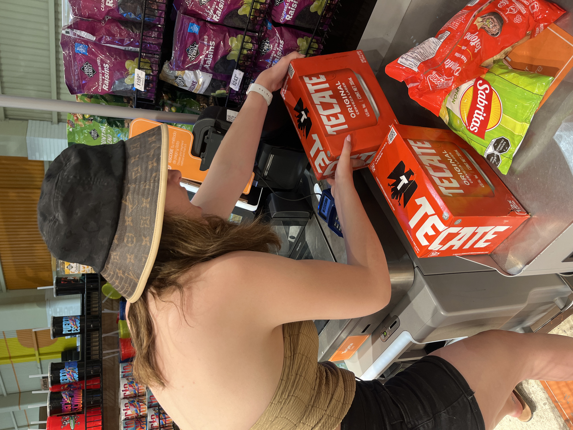 A woman with brown hair wearing a Louis Vuitton-branded hat, a tan strapless top, and black shorts is at a checkout counter. She is placing two 12-packs of Tecate beer on the counter. Next to the beer are two bags of Sabritas and Totis brand chips. Behind the woman are shelves stocked with various items including raisins and cans of soda, likely Puerto Escondido, Mexico, based on "PUERT" on the drink can. A card reader indicates payment options including "Tarjeta" (Spanish for "Card") and "BBV," suggesting a payment system.