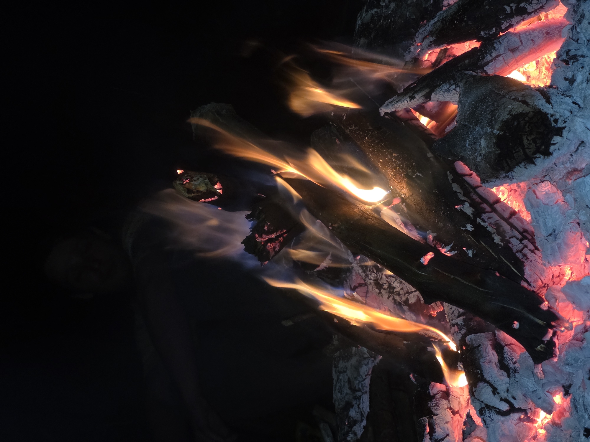 campfire in an unknown location. Embers glow red and white in the lower right and along the right edge, surrounding dark logs. Orange and yellow flames rise and swirl around the logs, moving to the left. In the lower left, obscured in darkness, is a blurred figure of a person. The background is otherwise black.