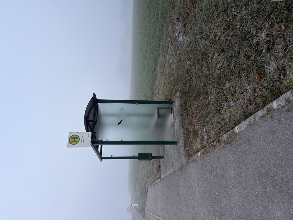 - "The image depicts a static, outdoor scene at a bus stop in Ferschnitz-Friedegg, Austria, on a heavily fog-obscured day" by FM-giR9z2, licensed under CC BY 4.0