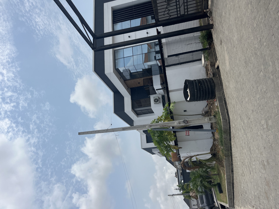 The image depicts a residential street scene in Ojomu, Nigeria, under a partly cloudy sky. In the foreground, a gray paver-tiled street curves slightly. A concrete curb separates the street from a narrow strip of unkempt ground. The central subject is a modern, two-story building with a white and dark gray exterior, featuring angular architectural elements. The building incorporates large, reflective blue-tinted glass windows on its facade, some spanning two floors, and dark vertical panels. An outdoor air conditioning unit is mounted on a white wall section of the building. The property is enclosed by a white perimeter wall, along which various green plants, including a young papaya tree and smaller palms, are growing. To the right of the building, a large, black, metal gate structure, possibly part of a driveway entrance, partially frames the scene. In the center-left foreground, a tall, gray concrete utility pole stands vertically, with electrical wires extending horizontally from it. The top of the pole appears jagged or unfinished. Adjacent to the utility pole and against the white wall, a cylindrical container constructed from stacked black tires is present, filled with what appears to be trash or debris. A small red and white sign is affixed to the white wall near the utility pole. On the far left, a portion of a dark-colored pickup truck is visible on the paved street. No individuals are present in the image.
