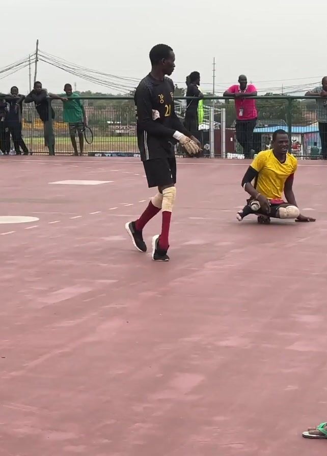 group of men on a red and white outdoor sports court. Some men are sitting on the ground in yellow shirts with black shorts. Other men are standing around the court, including three referees in red shirts and black shorts. One referee carries a soccer ball and another carries a yellow and black flag. A fence surrounds the court, and there are people watching from behind the fence. There is a sign with a green and white logo visible in the background. The weather appears to be overcast.