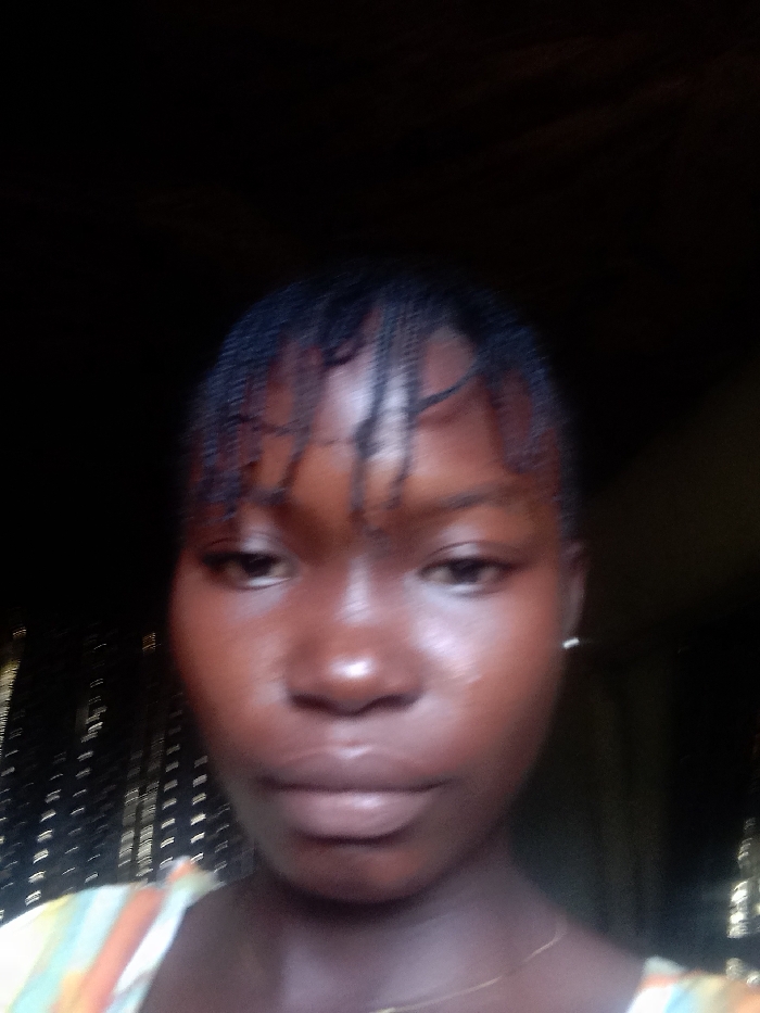 A frontal close-up image depicts an individual with dark skin, assumed to be in the city of Ajaokuta, Nigeria. The individual has dark, braided hair styled with bangs covering the forehead. Features include a prominent nose, full lips, and dark eyes looking directly forward with a neutral expression. A small, light-colored stud earring is present in the visible right earlobe, and a thin, gold-colored chain is visible around the neck. The upper part of a multi-colored striped garment, possibly orange, blue, and white, is visible on the subject's left side. The background is uniformly dark, indicating low light conditions or an interior setting with minimal illumination behind the subject. The lighting primarily illuminates the subject's face from the front.