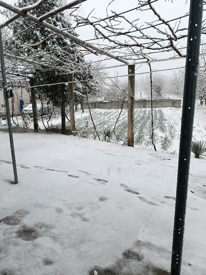 The image depicts a snow-covered outdoor scene in the city of Unknown, Unknown, under overcast conditions with visible falling snow. The foreground features a layer of fresh snow covering concrete or paved ground, displaying multiple distinct human footprints and paw prints leading into the frame from the left. A dark gray metal support post is visible on the far right, and a lighter gray metal post on the far left, both part of an overhead trellis structure draped with snow-covered bare vines. The midground includes several snow-laden evergreen trees, with a portion of a light-colored vehicle, possibly a car, discernible behind them to the left. Further back, a low concrete wall separates the foreground from a cultivated garden area, where rows of green plants are partially visible beneath a light dusting of snow. Several spiky plants, possibly yucca, protrude from the snow on the right side of the garden. Beyond the garden, the background shows additional snow-covered deciduous trees and faint outlines of structures, obscured by the wintry weather. No individuals are present, and no direct interactions are observed. The environment is characterized by a significant accumulation of snow and active snowfall.