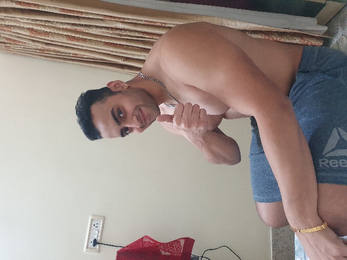 A shirtless man in gray athletic shorts is facing the camera and smiling while giving a thumbs-up. He has short dark hair and is wearing a silver necklace and a gold bracelet. The background includes a light-colored wall, an electrical outlet, and a red object. The top of the frame shows a textured, beige-toned curtain. The man is positioned at an angle, and the overall image appears to have been taken indoors.