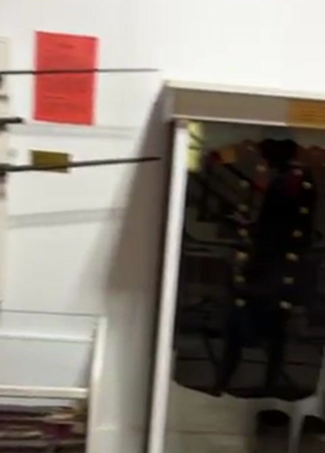 n exhibit of military memorabilia in what appears to be a museum. The camera pans across displays of rifles, uniforms in glass cases, informational posters, and a painting depicting a man carrying another through the snow. The walls are white with a red trim at the top. The setting is clean and well-lit, indicative of a curated historical exhibit.