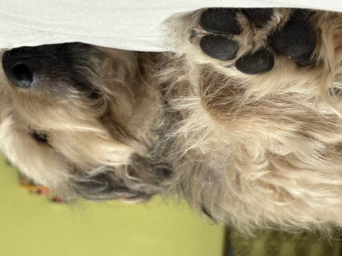 A domestic canine, characterized by its long, shaggy fur in shades of light brown, tan, and darker brown, is depicted sleeping on a white, soft surface. The animal rests on its side, with its eyes closed and a black nose visible on the right side of the frame. A front paw, featuring distinct black paw pads and visible claw tips, is positioned in the lower-left. The background is a blurred, solid light-green wall, indicative of an indoor setting. Minor, indistinct dark and colorful shapes are faintly visible in the upper-right background. No individuals are present, and no actions or interactions are occurring beyond the dog's state of rest. The scene is confined to an interior space.