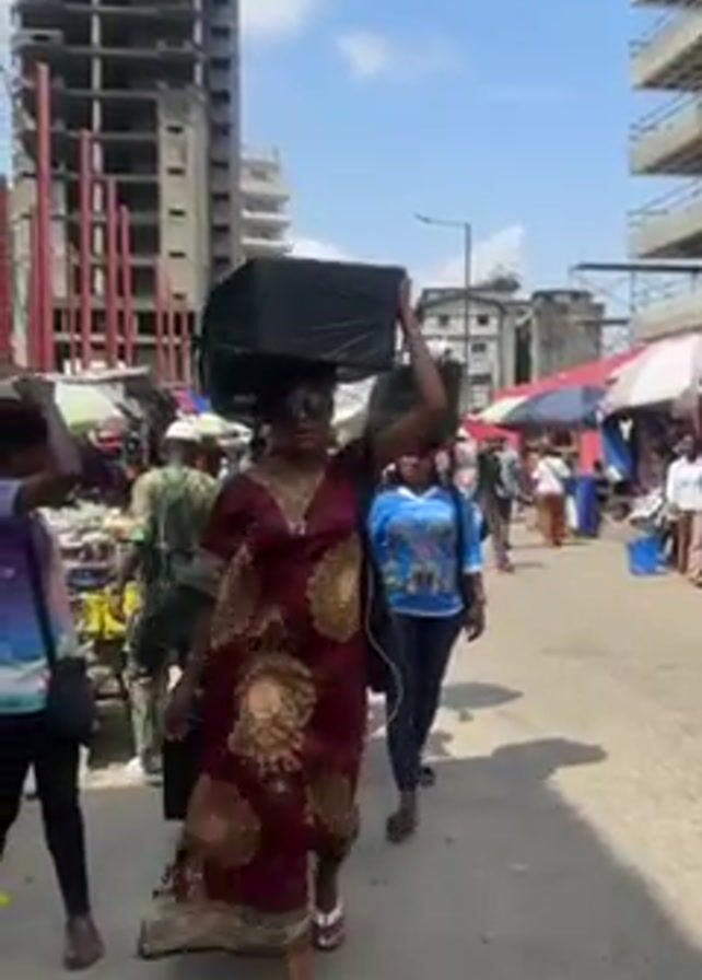 woman walking towards the camera in a busy outdoor market. She is wearing a red patterned dress, sunglasses, and large earrings, and she carries a large black bag on her head. The market is crowded with people and stalls, and there are several buildings visible in the background, including a high-rise under construction. The video seems to be shot with a mobile device, and it tracks the woman as she walks.