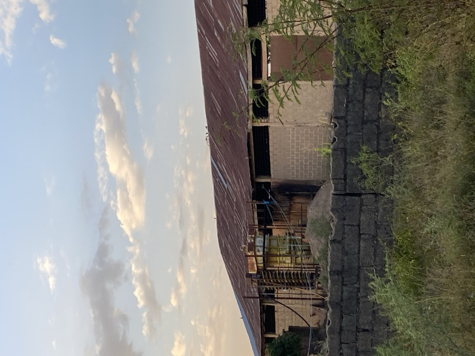 The image depicts an industrial or agricultural facility in Kirana, Nigeria, under a pale blue sky with scattered white and light orange clouds. The primary subject is a large, rectangular building constructed with unpainted concrete blocks. Its roof is made of heavily rusted, reddish-brown corrugated metal sheets. Several horizontal openings, possibly for ventilation, are visible directly beneath the roofline. On the left side of the building, a complex piece of industrial equipment is situated outside. This includes two light-colored, possibly yellow or pale green, cylindrical tanks mounted on a metal framework, connected by a prominent vertical helical or spiral structure, also metallic and rusted. Blue hoses or pipes extend from this equipment towards the building. A significant pile of light-colored granular material, possibly sand or gravel, rests on the ground in front of this machinery. To the right of the equipment, a section of the building's wall exhibits a dark, discolored area, potentially indicating charring or staining. Further to the right, a rectangular brown door or entrance is visible on the building facade. In the mid-ground, a low wall constructed of dark grey concrete blocks acts as a barrier. The foreground consists of various green and dry grasses and sparse leafy shrubs. Small, dark, indistinct shapes, likely birds, are visible perched on different sections of the rusted roof. No human subjects or explicit actions are discernible.