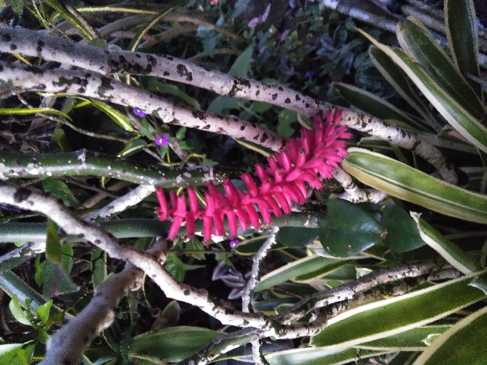 The image displays a close-up of botanical elements within a natural setting in Ciherang, Indonesia. The central subject is an elongated, fuchsia-pink, spiky inflorescence, approximately 15-20 cm in length, positioned slightly right of the vertical center and angled downwards. This flower spike is supported by a thick, dark green stem. Surrounding the inflorescence are multiple weathered branches, predominantly light grey with dark mottled patterns, crisscrossing the frame. A plant with prominent variegated leaves, characterized by green centers and pale yellow margins, occupies the lower foreground. The background consists of blurred green foliage, with faint indications of smaller purple flowers in the upper-right quadrant. No individuals or man-made objects are present.