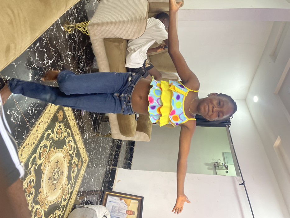 A young girl stands facing forward wearing a yellow and blue polka-dot top, and jeans, her arms outstretched with hands open. In the background, a person sits on a tan couch engrossed in a device. The room features a patterned marble floor with a decorative rug, along with a framed portrait on the ground. The walls are light-colored, and lighting equipment is visible towards the back of the room.