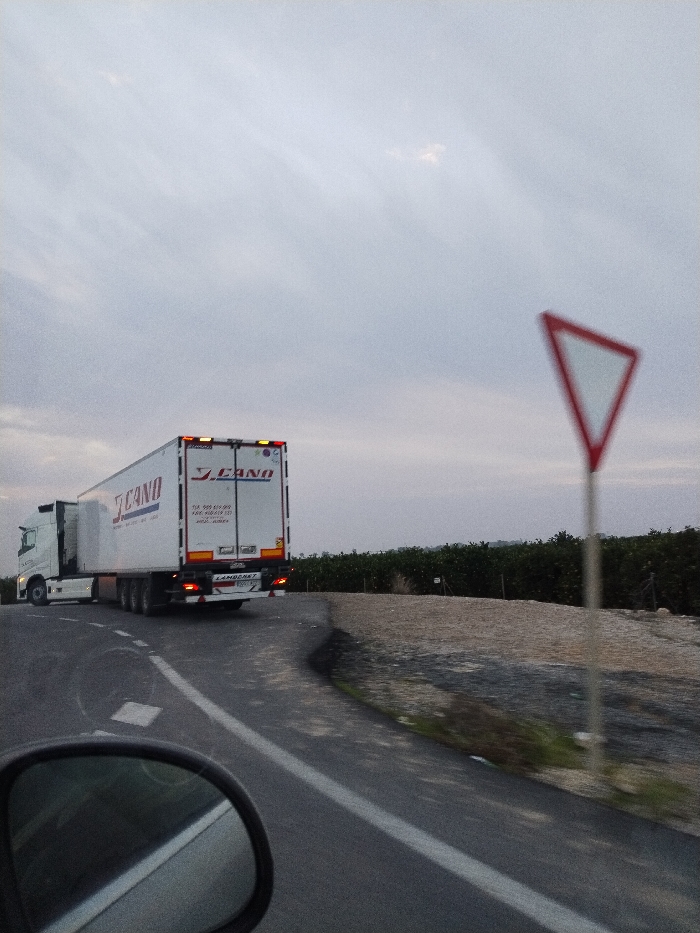 A white semi-trailer truck with "J. CANO" branding is on a gray road. A yield sign is prominently visible on the right side of the road. The roadside is lined with greenery and low walls. A side mirror of a car captures part of the frame, suggesting a driver's perspective. Overcast sky fills the background.