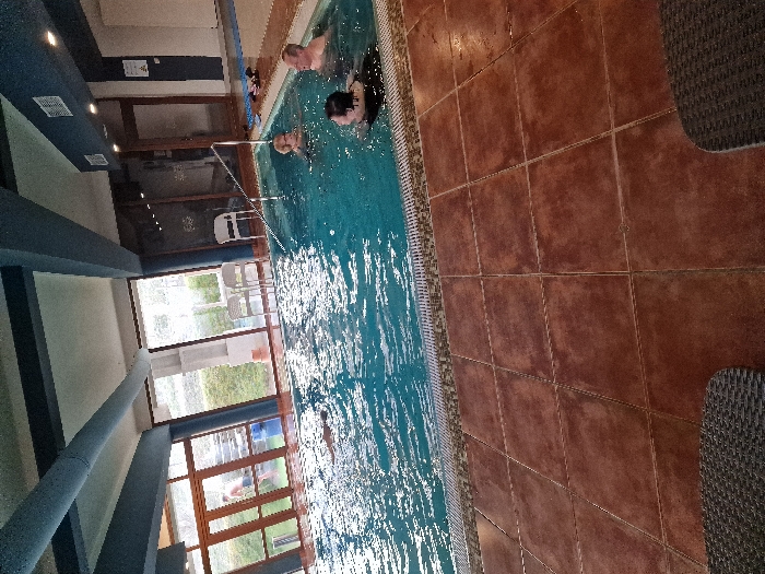 The image depicts an indoor swimming pool facility located in Odorheiu Secuiesc, Romania. A rectangular pool with blue water, exhibiting surface ripples, occupies the central and left portions of the frame. The pool is bordered by reddish-brown square floor tiles and a mosaic-patterned drainage edge. Three individuals are partially submerged in the pool on the right side. In the foreground, an individual with dark hair, appearing female, faces right. Behind her, an individual with a light/bald head, appearing male, faces slightly left. Further to the left and rear, a third individual with light hair, appearing female, faces right. A metal handrail extends into the pool near the three individuals. In the far left background, a partially visible individual, appearing male, stands outside the pool area beyond large glass doors and windows, which offer a view of green hedges and two white chairs. The interior features a light-colored ceiling supported by blue structural beams, equipped with vents and recessed lighting. On the tiled deck to the far right, blue mats and various personal items are visible. The extreme foreground contains the edge of a dark, wicker-patterned piece of furniture.