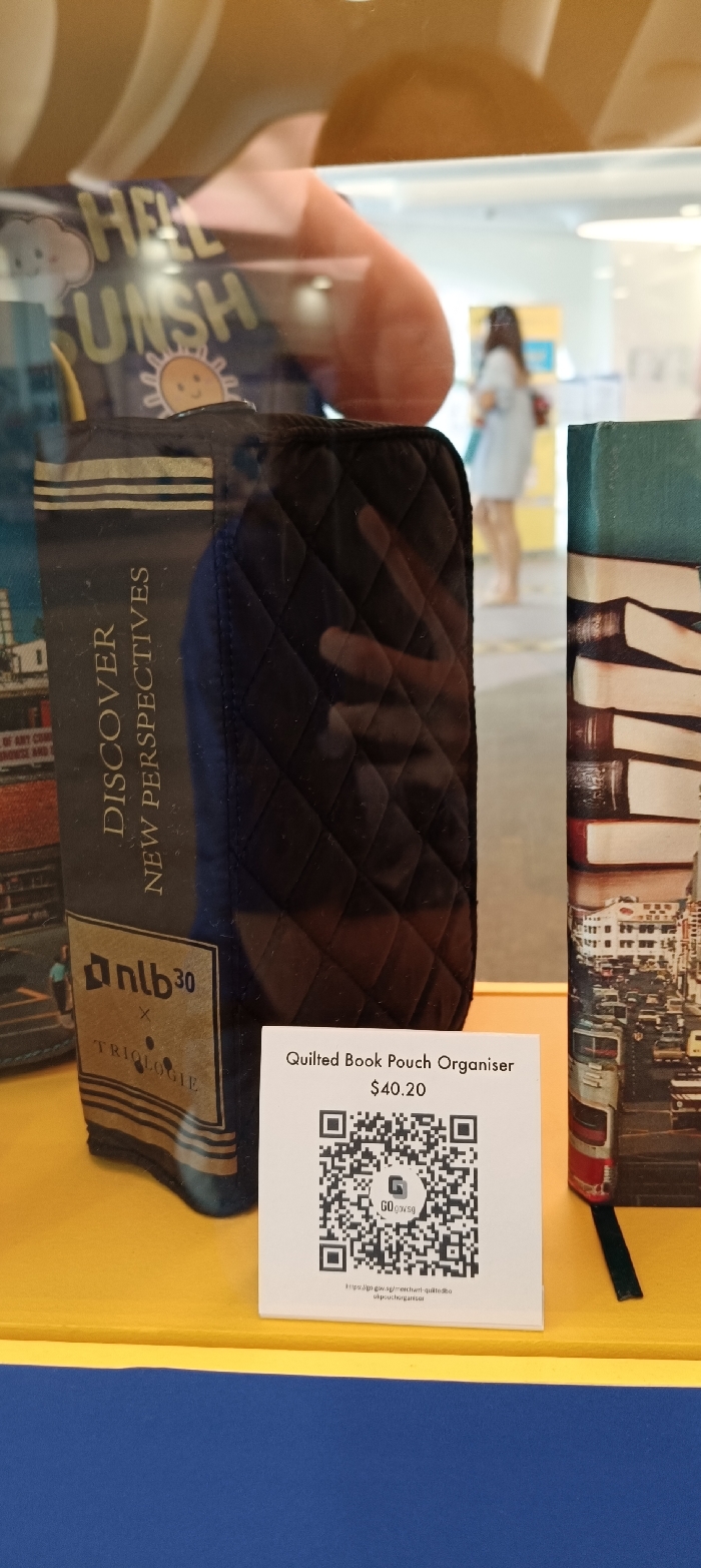 A display features a book-shaped organizer bag labeled "DISCOVER NEW PERSPECTIVES" next to a black, quilted pouch organizer. A printed card identifies the product as a "Quilted Book Pouch Organizer" and lists the price as $40.20. A QR code is also displayed on the card, accompanied by the text "GOgwsg" and a website address. The display sits on a yellow surface with a blue section below. A reflection reveals a person taking the photo and a blurry background.