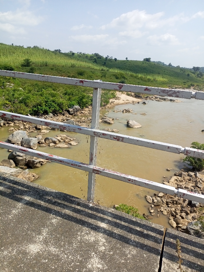 The image displays a panoramic view of a river and surrounding landscape, observed from a concrete structure, presumably a bridge, located in Akwanga, Nigeria