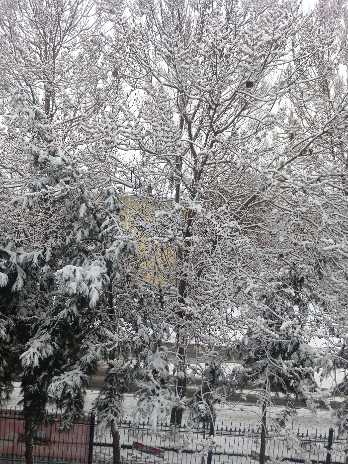 A winter scene depicts snow-covered trees, both deciduous and evergreen, in front of a building