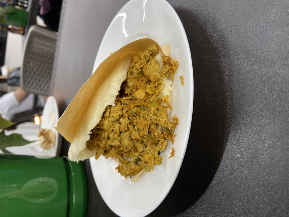 A white plate presents an open-faced sandwich filled with shredded, seasoned chicken. The bread is soft and holds a generous portion of the chicken. The dish is on a dark surface. Other restaurant seating and a green cylinder are slightly visible in the background, indicating an indoor setting. The food appears to be fresh and ready to eat.