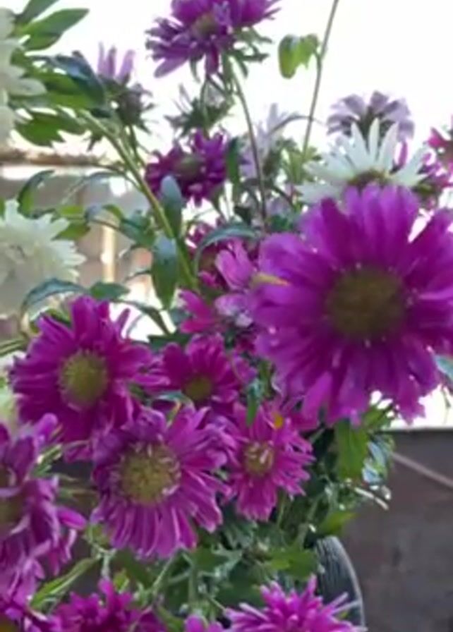 bouquet of asters being rinsed under running water. The flowers are predominantly purple and white, with green foliage. They are arranged in a dark-colored vase, likely ceramic or plastic. Water is being sprayed onto the flowers, with visible water droplets on the petals and leaves. The background appears to be an outdoor setting, with a hint of a cloudy sky visible. The lighting is natural and slightly overcast.