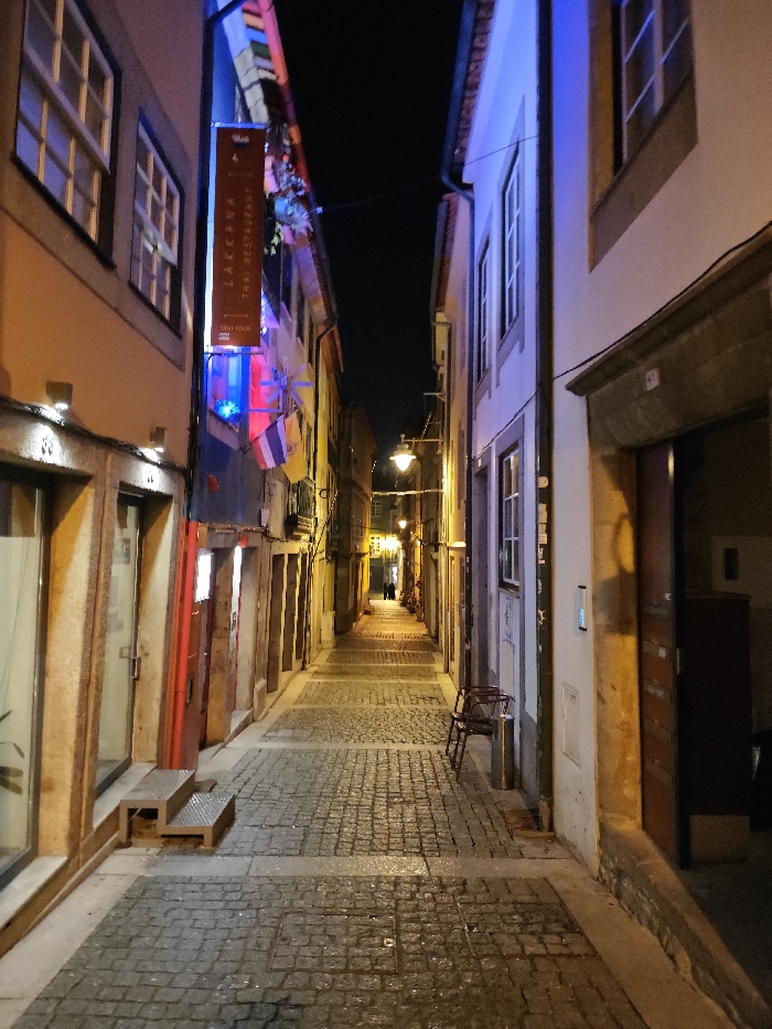A narrow cobblestone street at night, lined with buildings on either side. On the left, a restaurant called "LAKKANA Thai Restaurant" is marked by a sign and Thai flags. The buildings are illuminated with warm and cool lights. Two people can be seen walking far down the street. A chair and bin are positioned on the right. The image captures the ambiance of a quiet, historic European alleyway at night.