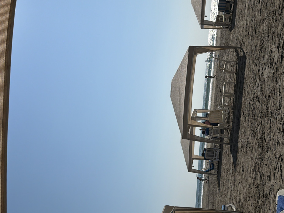 A beach scene features several sun shelters. Each shelter contains white plastic chairs. A figure runs near the shoreline. The sand is dark. The sky is clear and bright blue. A partial view of a structure appears on the left side of the frame. Part of another shelter is visible in the lower right corner. The ocean can be seen in the background, slightly blurred.