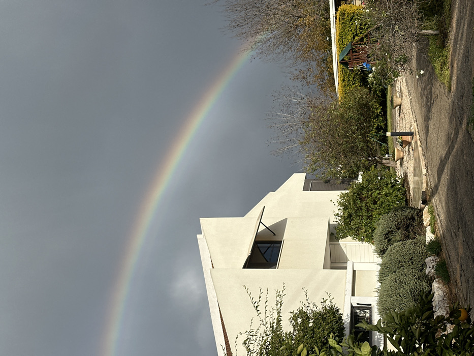 The image depicts a residential scene in Beit Yitshak Sha'ar Hefer, Israel, under a dark, overcast sky with a prominent rainbow spanning across the upper half of the frame. In the left foreground and midground, a two-story, cream-colored house with a modern, angular design is visible. The house features multiple windows, including one on the second floor with an open light-colored awning, and another on the ground floor with dark shutters. The property includes a garden with various green foliage, including bushes, small trees, and potted plants arranged along a paved pathway that curves through the yard. In the midground and background to the right of the house, more trees, some with sparse leaves, are present, alongside a children's playset featuring a slide and a small blue swing, partially obscured by a dense green hedge. No individuals are present or engaged in any actions within the depicted scene.