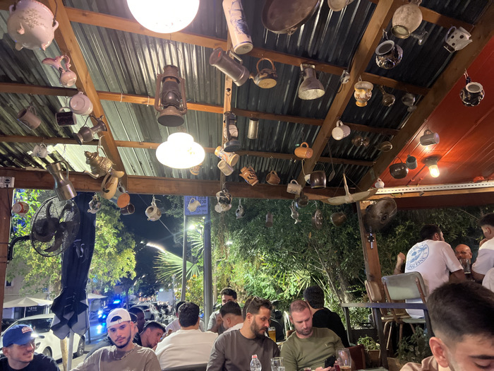 The image depicts an evening scene at a casual outdoor or semi-outdoor restaurant or bar located in Rishon LeZion, Israel