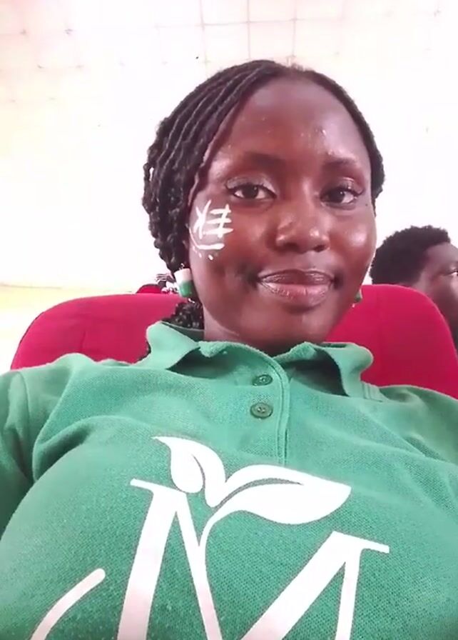 A person with dark complexion and braided hair is shown from the chest up, facing the camera and smiling. They are wearing a green collared shirt with a white logo. There is white paint or makeup on their face. They are seated in a red chair. A person's face is visible in the background, slightly out of focus. The ceiling above appears to be white and patterned.