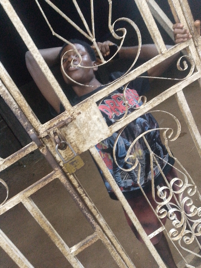 Through a faded gold gate secured with a padlock, a young person looks up. They wear a dark t-shirt with a red logo, and a second, busy patterned shirt can be seen beneath the first. The person rests their arms behind their head, with hands visible gripping the gate. The background appears dark, suggesting an enclosed area. The gate's design includes bars and decorative swirls.