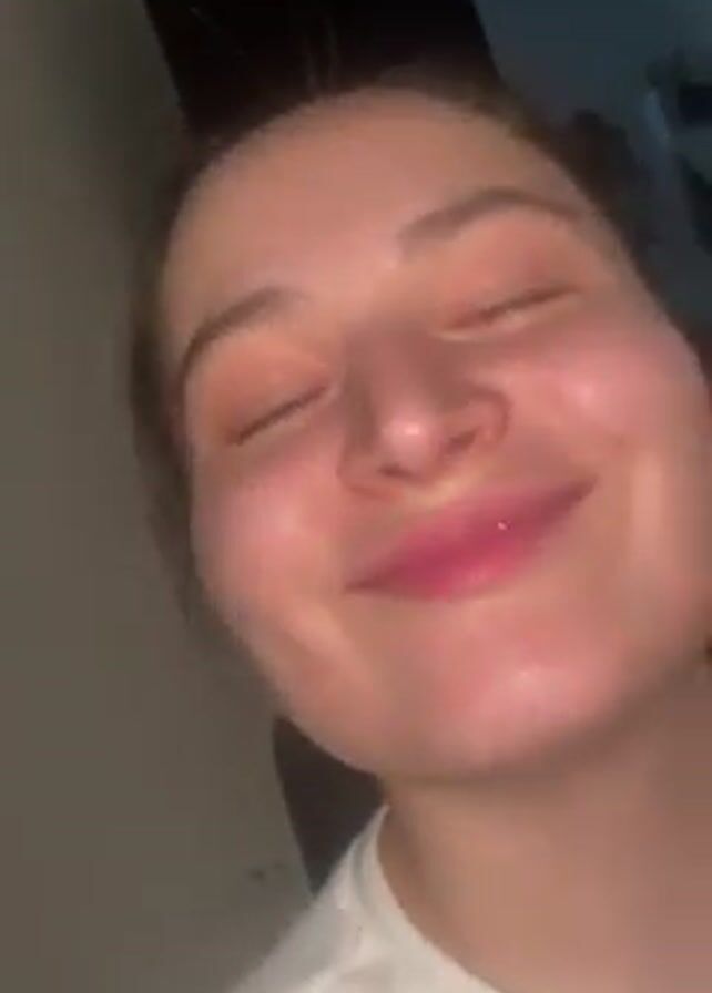 A close-up video shows a young woman with fair skin, light brown hair pulled back, and wearing a white t-shirt