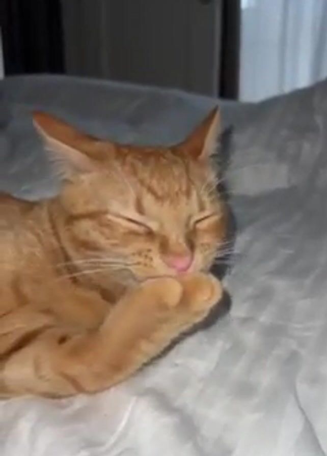 A reddish-tan tabby cat is lying on its side on a bed covered with white linens and is grooming itself. The cat is licking its front left paw and has its eyes closed. A door with a shiny metal handle is visible in the background to the left of the cat. A white curtain hangs in the background as well. A voice is heard in the background saying, "Hello. You're scaring him? How? How are you scaring him?"