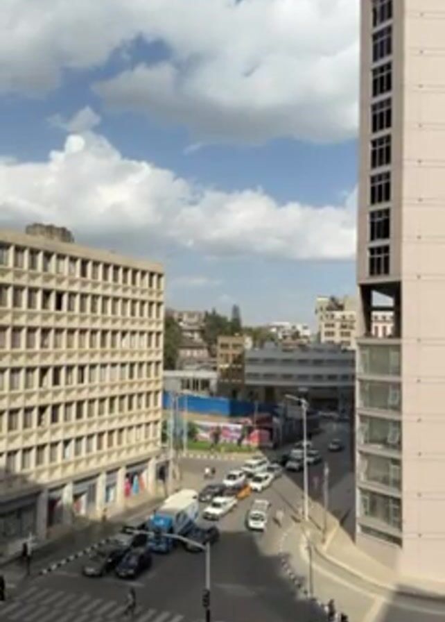 street scene from an elevated perspective. The sky is blue with scattered white clouds. Two tall buildings flank the street. The building on the left is blocky with numerous square windows. The building on the right is taller and slender, with a light color and similar window arrangement. Traffic flows along the street, consisting of various cars and small trucks. A crosswalk is visible in the foreground, with pedestrians crossing. Other buildings and some greenery can be seen in the distance. The overall lighting is bright, suggesting a sunny day.