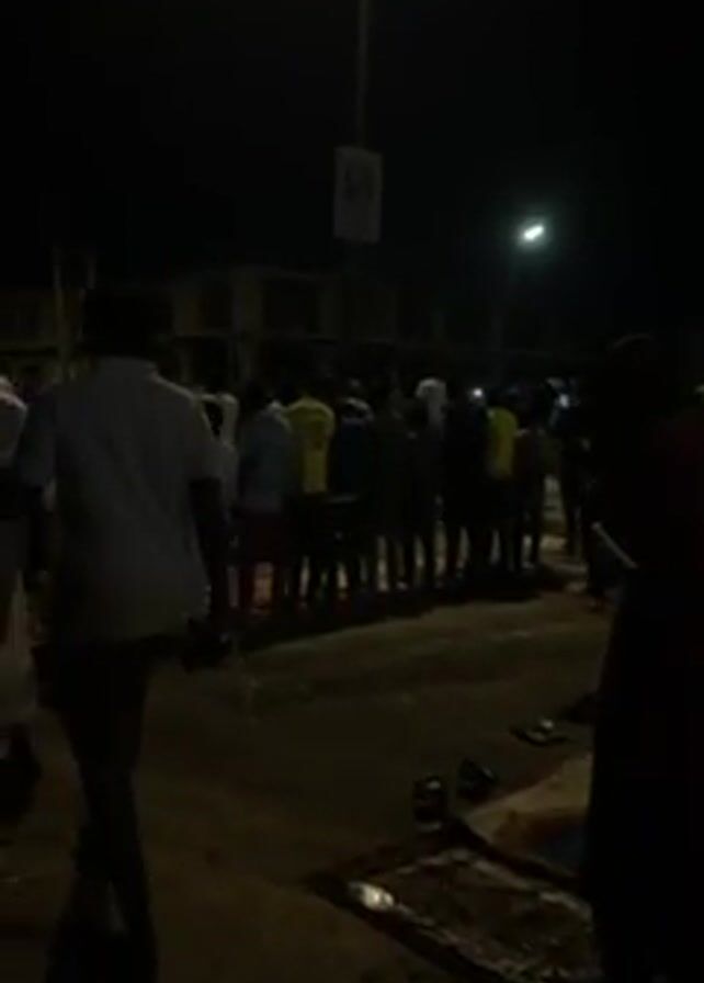 At night, a group of people are lined up outside, facing away from the camera. They appear to be praying on prayer mats. Some individuals are walking around or standing near the praying group. A car is parked in front of the group of people. Streetlights illuminate the scene. The backdrop includes buildings and structures.