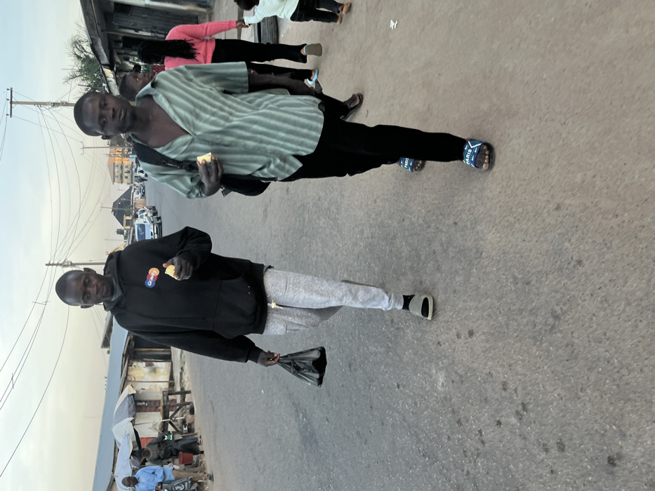 This image depicts an outdoor street scene in Jos, Nigeria, under an overcast sky. In the foreground, two adult males walk side-by-side towards the viewer. The male on the left is dark-skinned, wears a black hooded sweatshirt with a multi-colored "Gravity" logo, light grey sweatpants, black socks, and grey slide sandals. He holds a light-colored food item, possibly a piece of bread or pastry, in his right hand and a black plastic bag in his left hand. The male on the right, also dark-skinned, wears an unbuttoned light green and white striped short-sleeved shirt, dark trousers, and blue slide sandals with "PARIS" written on the strap. He carries a dark backpack over his right shoulder and holds a similar light-colored food item in his left hand. Behind these two individuals, other pedestrians are visible. To the right, a woman in a pink long-sleeved top and dark pants walks away from the viewer, accompanied by a small child in a light-colored top and dark pants, also walking away. Further back on the left side of the street, several men are seated near makeshift stalls or structures with corrugated metal roofs. One man wears a light blue shirt. White and silver vehicles are parked or driving further down the street on the right. The environment consists of a paved asphalt road, with unpaved or dirt sections on the sides. Utility poles with overhead wires are visible against the sky. Buildings bordering the street appear to be single-story structures, some with unfinished or basic facades. The overall lighting suggests either early morning or late afternoon with diffuse light.