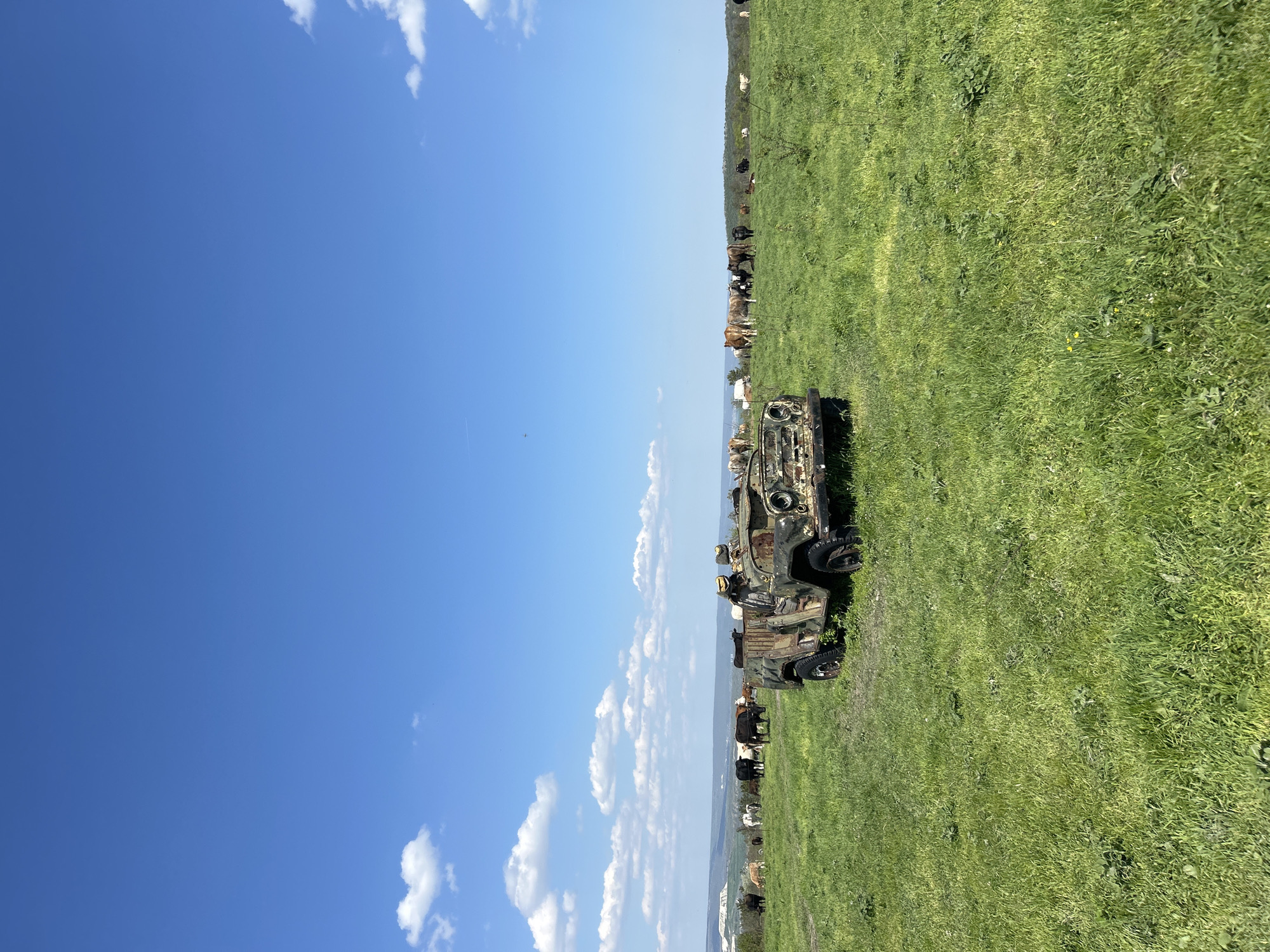 field in Avren, Bulgaria, on a sunny day. The sky is blue with scattered clouds. A rusty, dilapidated vehicle sits in the green grass. A herd of cattle grazes in the distance.