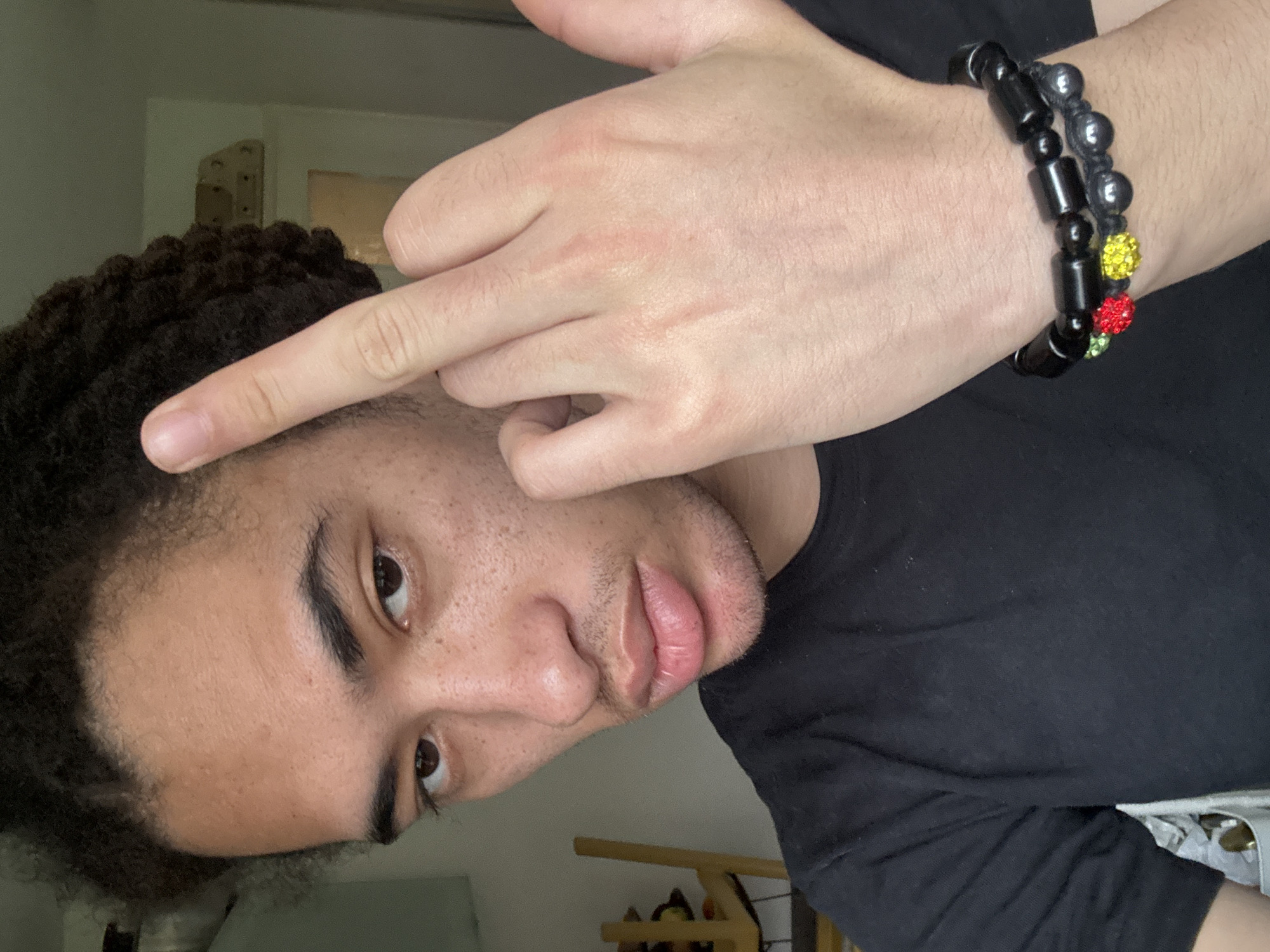 A male individual, appearing to be a young adult with medium-dark skin tone, dark eyes, and dark, tightly curled hair, is depicted in a close-up portrait. He exhibits light stubble on his jawline and chin, and scattered freckles across his nose and cheeks. The subject is wearing a black short-sleeved t-shirt. His right hand is raised to shoulder level, with the middle finger extended vertically and the other fingers curled, performing a commonly recognized rude gesture. On his left wrist, two bracelets are visible: an upper bracelet composed of black cylindrical beads, and a lower bracelet of smaller, dark, round beads featuring distinct red and yellow clustered decorative elements. The background is out of focus, revealing an indoor setting. To the left, a portion of a light-colored wooden chair or stool is visible. To the right, a light-colored wall or doorframe is present, with a small, light-colored wooden object mounted on it. The scene is located in the city of Les Ulis, France.