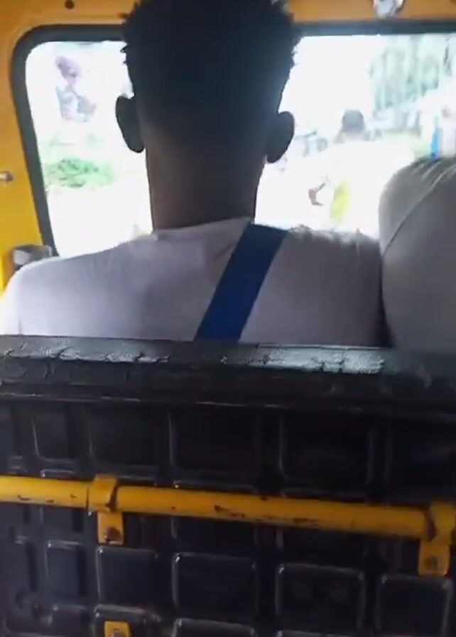 From the back seat of a yellow tuk-tuk, two individuals can be observed