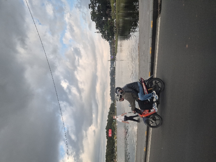 The image depicts a scene along Xuan Huong Lake in Da Lat, Vietnam. In the mid-ground, a red and black motorcycle travels from left to right on a dark asphalt road. Two individuals are riding the motorcycle; both wear helmets, with the driver in a dark jacket and the passenger in a black jacket and blue jeans. To the left of the motorcycle, a man wearing a white shirt, dark pants, and a white face mask walks along a paved pathway adjacent to the lake. The lake water is visible beyond the pathway, with reflections. On the far side of the lake, trees and some structures, including a red sign, are visible. The sky above is largely overcast with dark grey clouds, though some patches of lighter sky and blue are present, and a dark cable traverses horizontally across the upper frame.