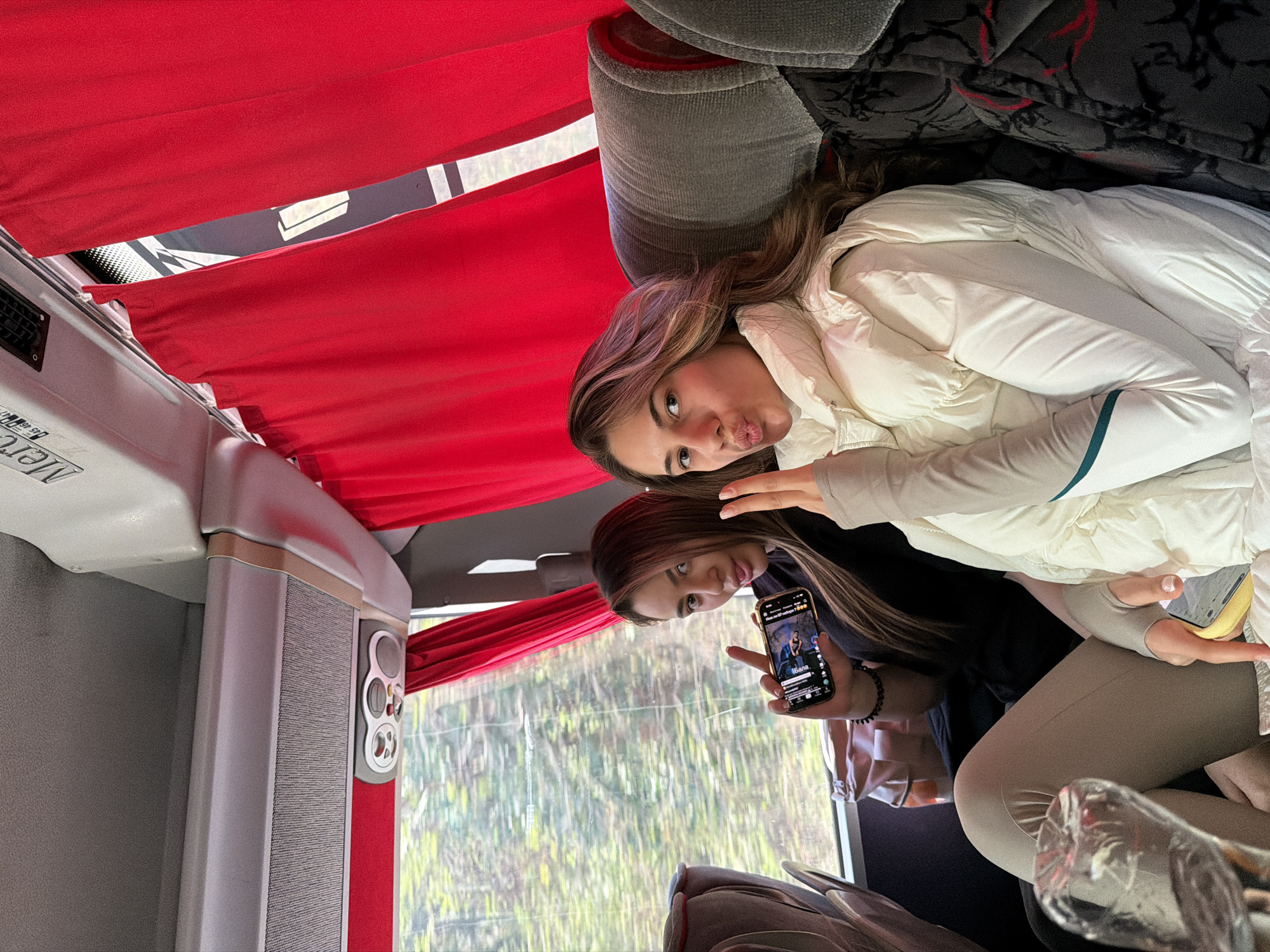 two young women sitting in what appears to be a bus. One woman, dressed in a white puffer jacket, is positioned closer to the camera and is pouting her lips in a playful manner. The other woman, partially visible behind her, is holding a smartphone, which displays a picture of a person. The bus has red curtains, and the view through the window suggests a natural environment with trees. The city and exact location of Dolno Osenovo, Bulgaria cannot be validated from the image.