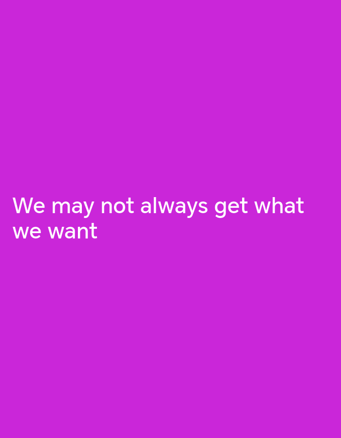 The scene, located in Ijoko, Nigeria, displays a solid magenta background. White sans-serif text is horizontally centered and situated in the lower-left quadrant of the frame. The text reads: "We may not always get what we want". No individuals, distinct objects, or detailed environmental features beyond the colored background are present.
