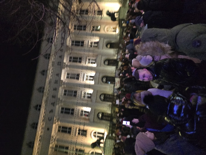 A nighttime shot shows a large crowd assembled in front of a lit building. The building appears to be governmental, possibly a courthouse, judging by the architectural style and visible text on the facade. The crowd is dense and individuals are wearing winter clothing, suggesting a possible protest or gathering during colder months. The scene is captured at an angle, adding a dynamic perspective. The lighting emphasizes the building's architecture and the gathering.