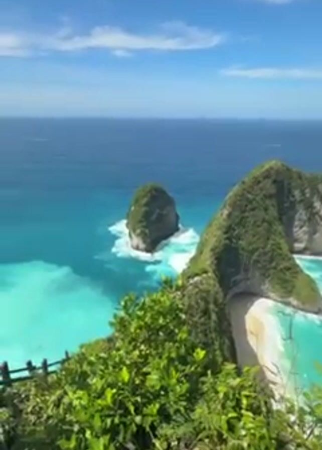 scenic view of Kelingking Beach in Nusa Penida, Bali, Indonesia. From an elevated vantage point, the landscape reveals the distinct T-Rex shaped cliff, covered in green vegetation, meeting the white sandy beach below. The turquoise waters crash against the shore, contrasting with the deeper blue of the ocean. In the distance, a smaller, similarly vegetated island sits in the water. Lush green foliage lines the foreground of the video and a partial view of a wooden fence is visible on the left. The sky is bright blue with scattered white clouds.