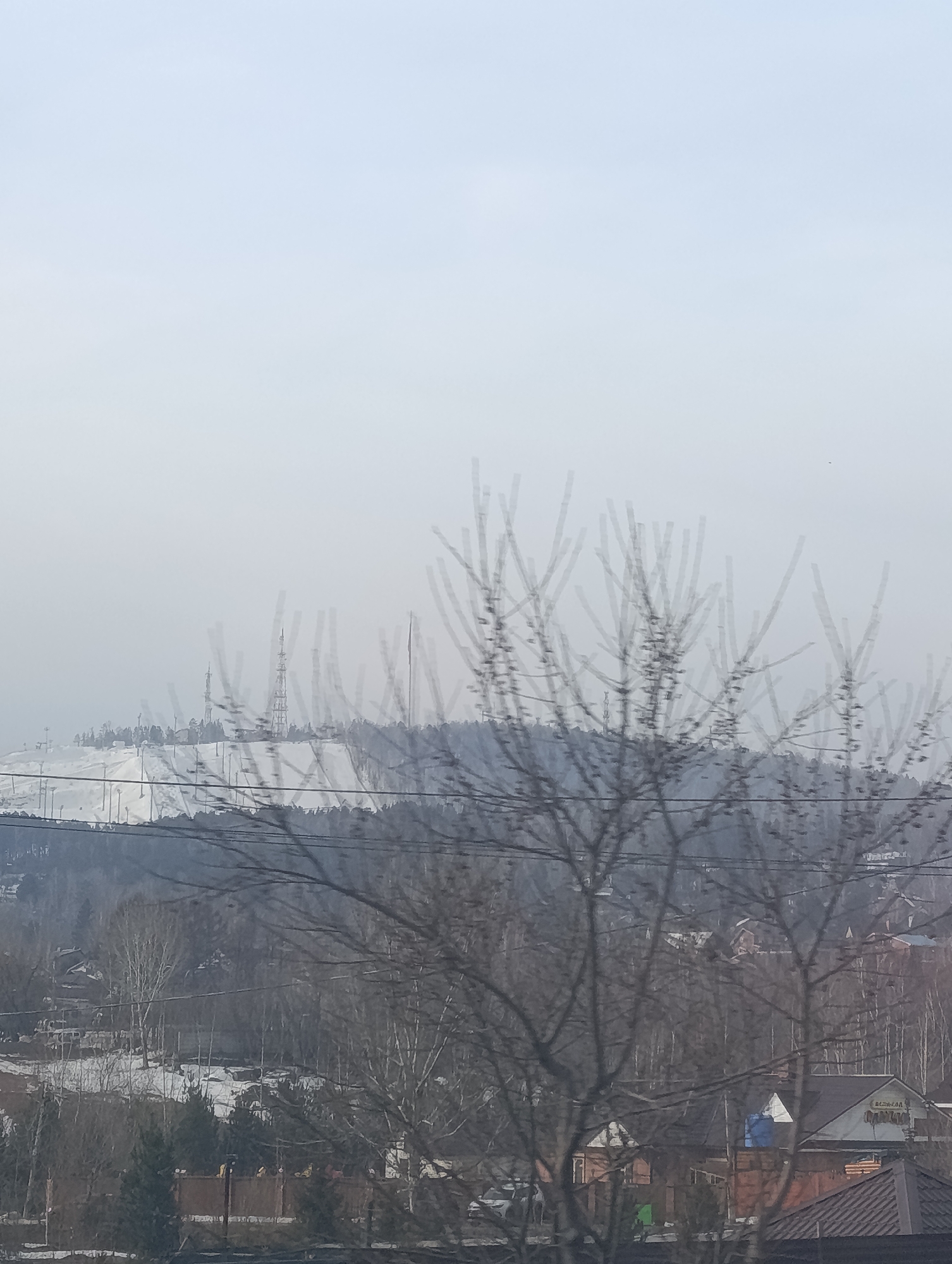 The image depicts a winter scene in Krasnoyarsk, Russia. In the foreground, a bare tree stands against a backdrop of a wooded area interspersed with houses. The rooftops of the houses are visible amidst the trees, some covered with snow. In the mid-ground, there is a snow-covered hill or mountain, with various structures, including radio towers. The sky is overcast and grey, suggesting a cloudy winter day.