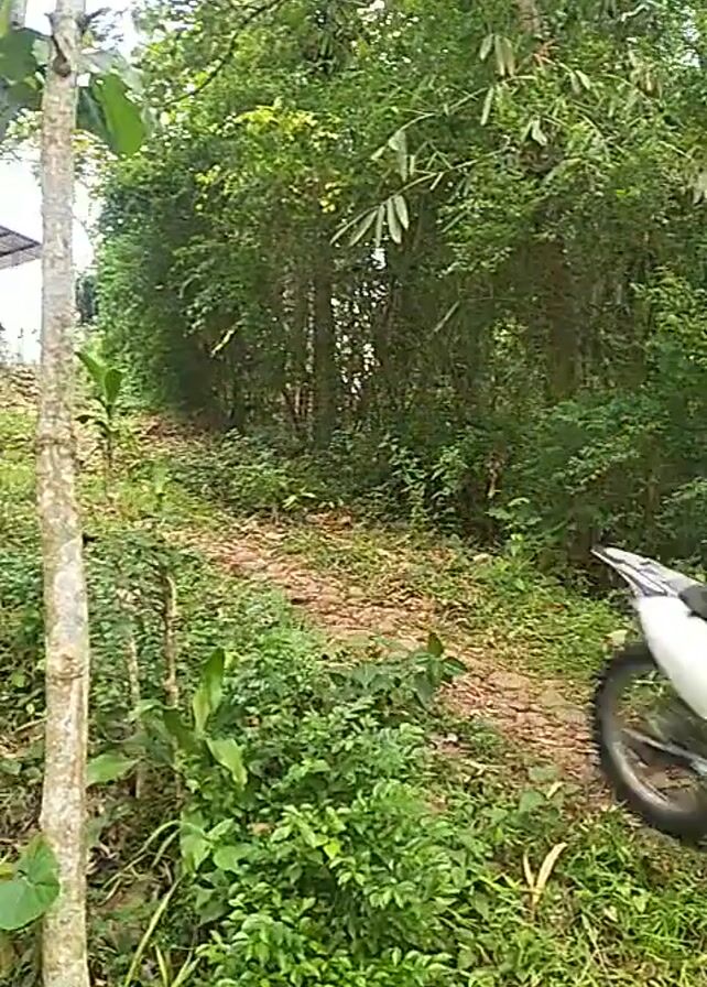 A man is riding a motorcycle on a narrow dirt path in a wooded area. He is wearing a helmet and protective gear. The path is lined with trees and vegetation. The video is taken from behind a makeshift fence made of tree branches. The man rides by the fence, then further down the path, and out of view.