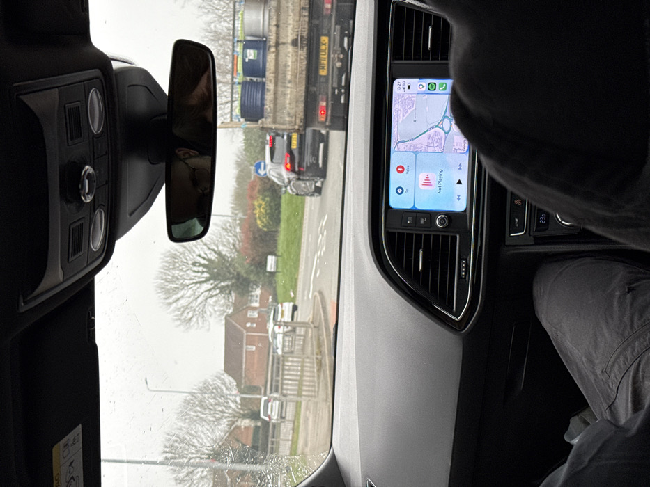 The image depicts a view from the interior of a grey vehicle, looking forward through a windshield partially obscured by rain droplets. The setting is an overcast day at a road junction in Harlow, United Kingdom. **Inside the vehicle (foreground):** The dashboard of a modern car, likely a SEAT Leon, is prominent. Its infotainment screen displays an Apple CarPlay interface, split between a "Not Playing" music application on the left and a map application (Google Maps) on the right. The map shows the junction of Edinburgh Way (A414) and Fifth Avenue (B183) in Harlow, indicating the vehicle's position on an approach road to this specific intersection. The screen also displays the time "13:27" and a "5G" network indicator. Below the screen, the climate control reads "23.0" degrees Celsius. The rearview mirror reflects two individuals: a driver wearing glasses and a passenger. The lower torso and legs of a passenger, dressed in dark trousers, are visible on the left side of the frame, while the upper back and shoulder of the driver are visible on the right. An overhead console and a sun visor with an "AIRBAG" warning are visible at the top of the frame. **Outside the vehicle (background):** A road junction is visible ahead. Directly in front, a dark-colored SUV, possibly an Audi Q5, displays illuminated rear lights. Behind the SUV is a flatbed truck loaded with multiple blue and silver barrels/drums; its UK license plate, "MP11 ULX," is legible. Further to the left, a white SUV is parked behind a wooden pedestrian gate or fence structure. In the distant background on the left, several residential brick houses are visible. The landscape features bare deciduous trees and evergreen shrubs with reddish foliage along the roadside. Infrastructure includes a street lamp post, a small white rectangular sign (text illegible), and a blue circular road sign indicating a mandatory direction. The sky is uniformly overcast.