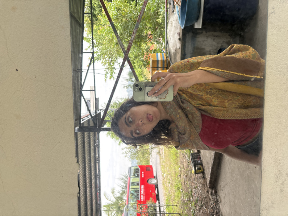 A person reflected in a mirror holds a smartphone taking a selfie, sticking out their tongue. The person wears a red top and patterned shawl. The mirror reflects an outdoor scene with a red bus, vegetation, and overhead metal structure. The backdrop includes a mix of natural and urban elements. The selfie is taken at an angle, emphasizing the casual and playful nature of the photograph.